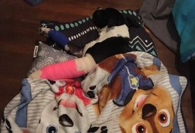 Pirate escaped from his youngest human and her grandma when mom was out of town for work. His 10 yr old human, was able to carry him home with the help of a construction worker after being hit by a car. He ended up with an amputation and is recovering wonderfully.