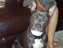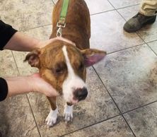 Olive is right at a year old. She slipped passed her owner and was hit by a car over the weekend. She required amputation on her leg, which was done at Helping Hands. She is now home recovering.